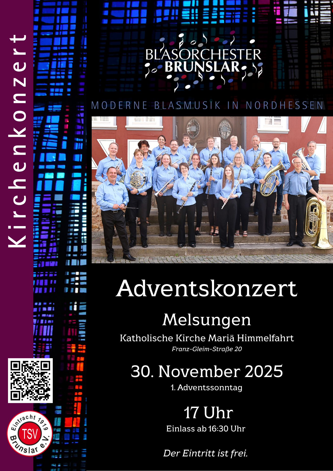 Adventskonzert Das Blasorchester Brunslar und die Katholische Kirchengemeinde Mariä Himmelfahrt Melsungen laden am 1. Adventssonntag herzlich zum Kirchenkonzert ein. Auf dem Programm stehen moderne Blasmusikstücke sowie vorweihnachtliche Lieder, die die Adventszeit musikalisch eröffnen. 30. November 2025Das Konzert beginnt um 17 Uhr (Einlass ab 16:30 Uhr), der Eintritt ist frei. Katholische Kirche Mariä Himmelfahrt MelsungenFranz-Gleim-Straße 2034212 Melsungen